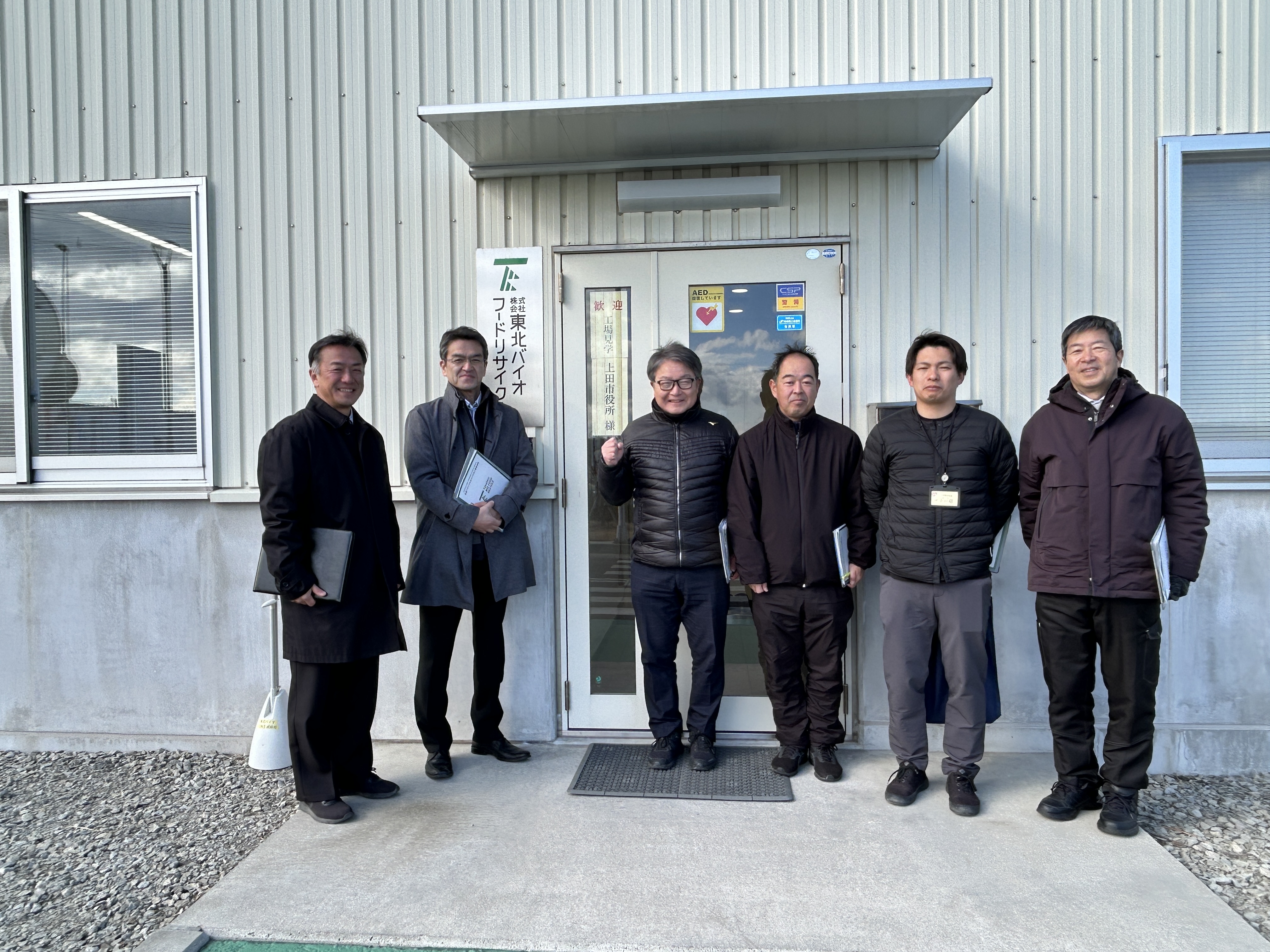 2026年1月23日、上田市役所から6名の方が当社工場をご来訪されました。仙台市が取り組む【脱炭素先行地域】の「定禅寺通等食品リサイクル推進モデル事業」協力会員である東北バイオをご視察されました。食品リサイクル向上の取り組み、Wリサイクルループ構築について説明させていただきました。